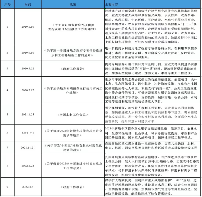 2022年3月5日,李克強(qiáng)在政府工作報(bào)告中提出,今年著力穩(wěn)定宏觀經(jīng)濟(jì)大盤(pán),保持經(jīng)濟(jì)運(yùn)行在合理區(qū)間。要用好政府投資資金,積極擴(kuò)大有效投資。圍繞國(guó)家重大戰(zhàn)略部署和“十四五”規(guī)劃,適度超前開(kāi)展基礎(chǔ)設(shè)施投資。建設(shè)重點(diǎn)水利工程、綜合立體交通網(wǎng)、重要能源基地和設(shè)施,加快城市燃?xì)夤艿赖裙芫W(wǎng)更新改造,完善防洪排澇設(shè)施,繼續(xù)推進(jìn)地下綜合管廊建設(shè)。今年擬安排地方政府專(zhuān)項(xiàng)債券3.65萬(wàn)億元,強(qiáng)化績(jī)效導(dǎo)向,堅(jiān)持“資金跟著項(xiàng)目走”,合理擴(kuò)大使用范圍,支持在建項(xiàng)目后續(xù)融資,開(kāi)工一批具備條件的重大工程、新型基礎(chǔ)設(shè)施、老舊公用設(shè)施改造等建設(shè)項(xiàng)目。