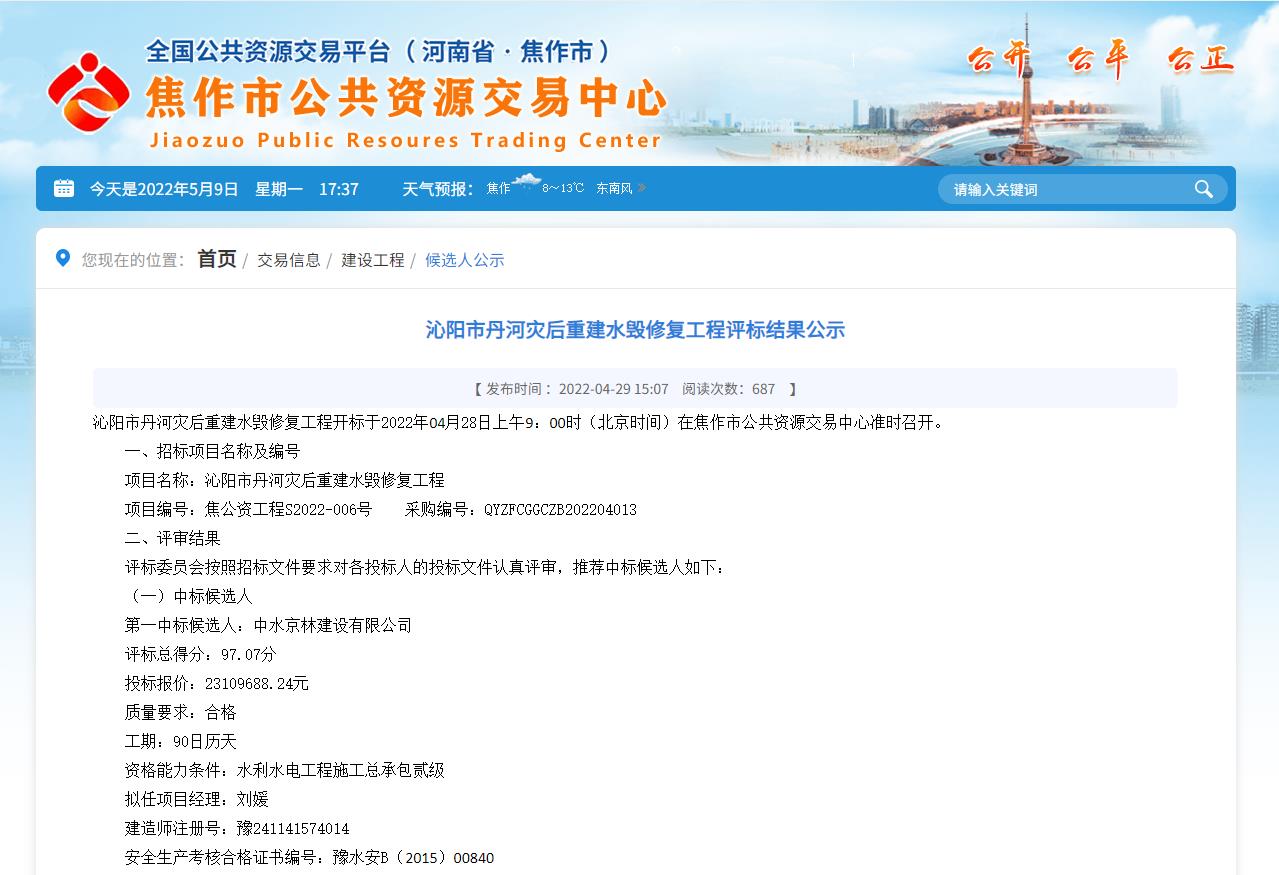 2022年4月29日,焦作市公共資源交易中心傳來喜訊,我司參與的沁陽市丹河災(zāi)后重建水毀工程被確定為第一中標(biāo)候選人,中標(biāo)金額23109688.24元,這是我司水毀類工程的新突破,也是我公司良好信譽與綜合實力的再次體現(xiàn)。