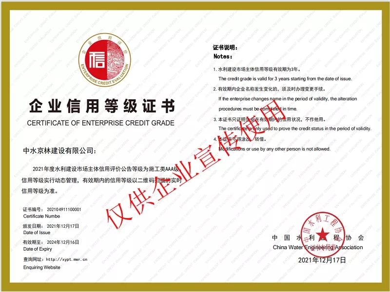 2021年12月17日,中國水利工程協(xié)會公布了2021年度全國水利建設(shè)市場主體信用評價結(jié)果,我司喜獲AAA信用等級證書。這是繼8月份我司獲得“水利安全生產(chǎn)標(biāo)準(zhǔn)化一級達(dá)標(biāo)單位”榮譽(yù)稱號后,又一次得到水利部的褒獎。